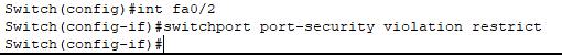 Restrict: Similar al anterior, solo dejara pasar el trafico de la mac address configurada y las tramas (frames) de otras mac address se ignora, solo que cuando se selecciona esta opción se guarda un log donde te envía información de en que puerto se cometió una violación de restricción, adicional en la interfaz aumentara un contador que nos permite observar cuantas veces se ha intentado conectar un hosts no permitido.